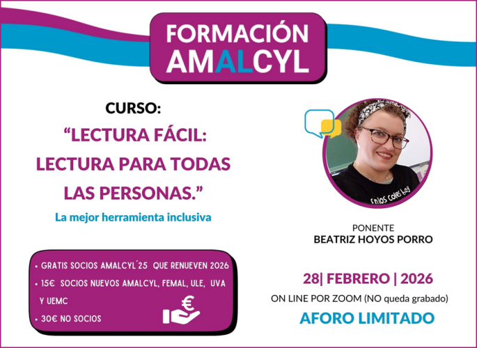 La asociación AMALCYL organiza esta formación online con Beatriz Hoyos Porro el próximo 28 de febrero de 2026 en horario de 9:30 a 13:30.